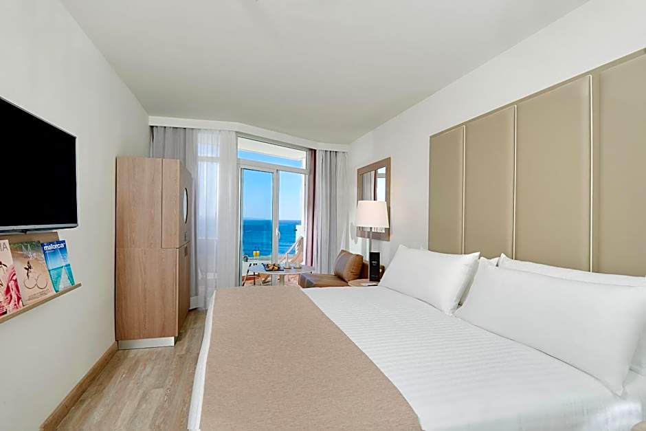 Melia Connecting Room Front Sea View is 538 square feet and includes either a double bed 131-150 width or 2 single beds 80-130 width plus balcony, terrace, satellite tv , hairdryer, tea and coffee making facilities , and safe and is Wheelchair-accessible.